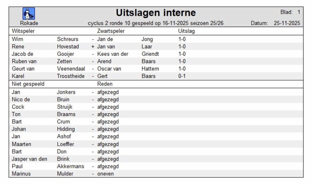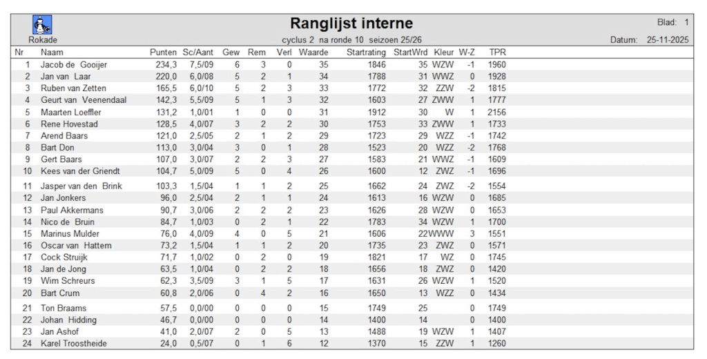 De tussenstand van de interne competitie van het huidige seizoen. Hieronder de ranglijst en kruistabel tot en met de laatst gespeelde ronde.