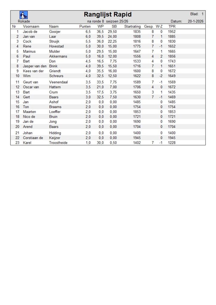 seizoen 2025/2026 De ranglijst van de rapidcompetitie van het huidige seizoen. kalender interne uitslagen